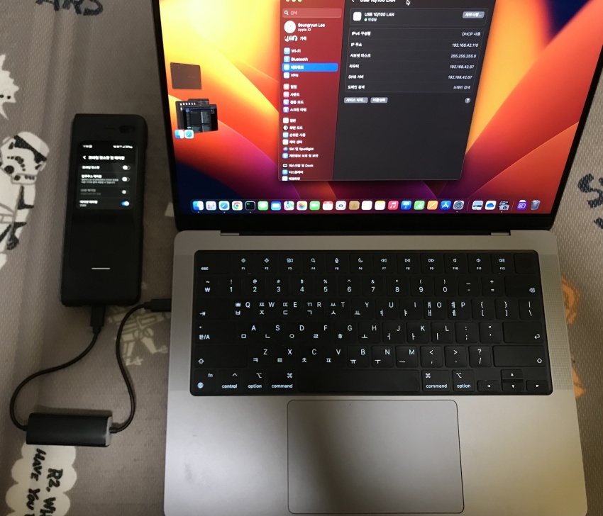 안드로이드폰과 맥북에 각각 USB를 꽂은 후에 휴대폰에서 "이더넷 테더링"을 활성화 시키면