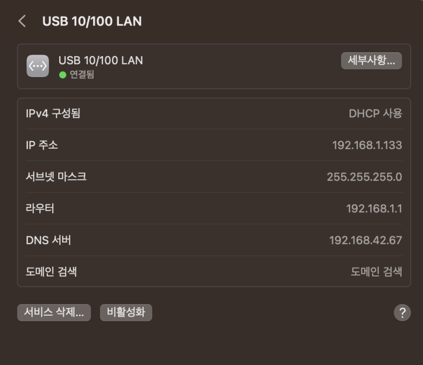 맥북쪽 랜카드에서 IP를 받아와서 인터넷이 잘 되는걸 확인 합니다.