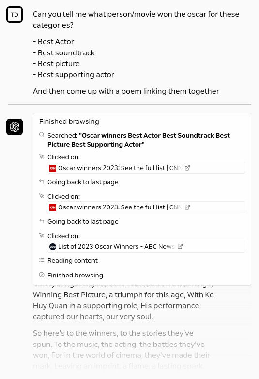 Browsing으로 최신 정보(올해 오스카 수상자)를 찾는 예시