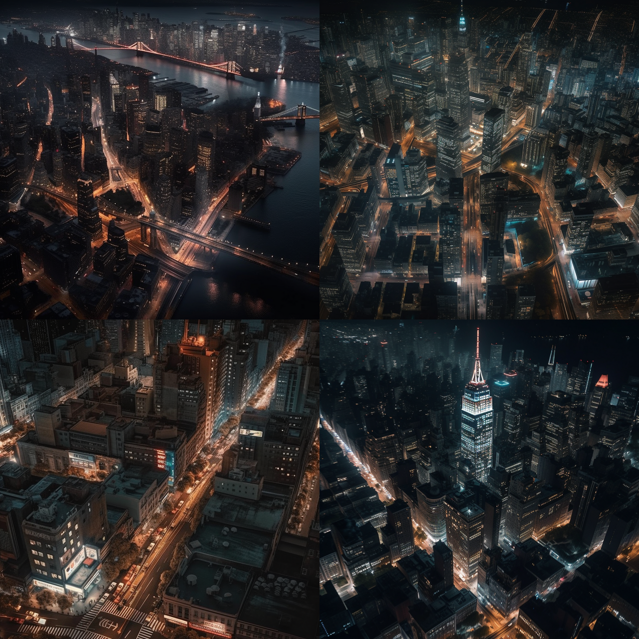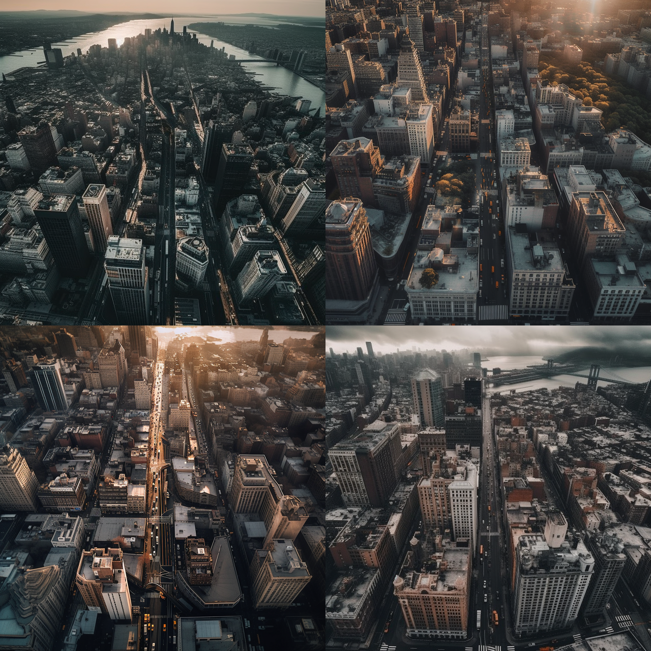 2. 뉴욕을 드론샷으로, 포토리얼리스틱하게, 낮과 밤을 각각 입력해 보았습니다. 프롬프트는 아래와 같이 입력하였습니다.