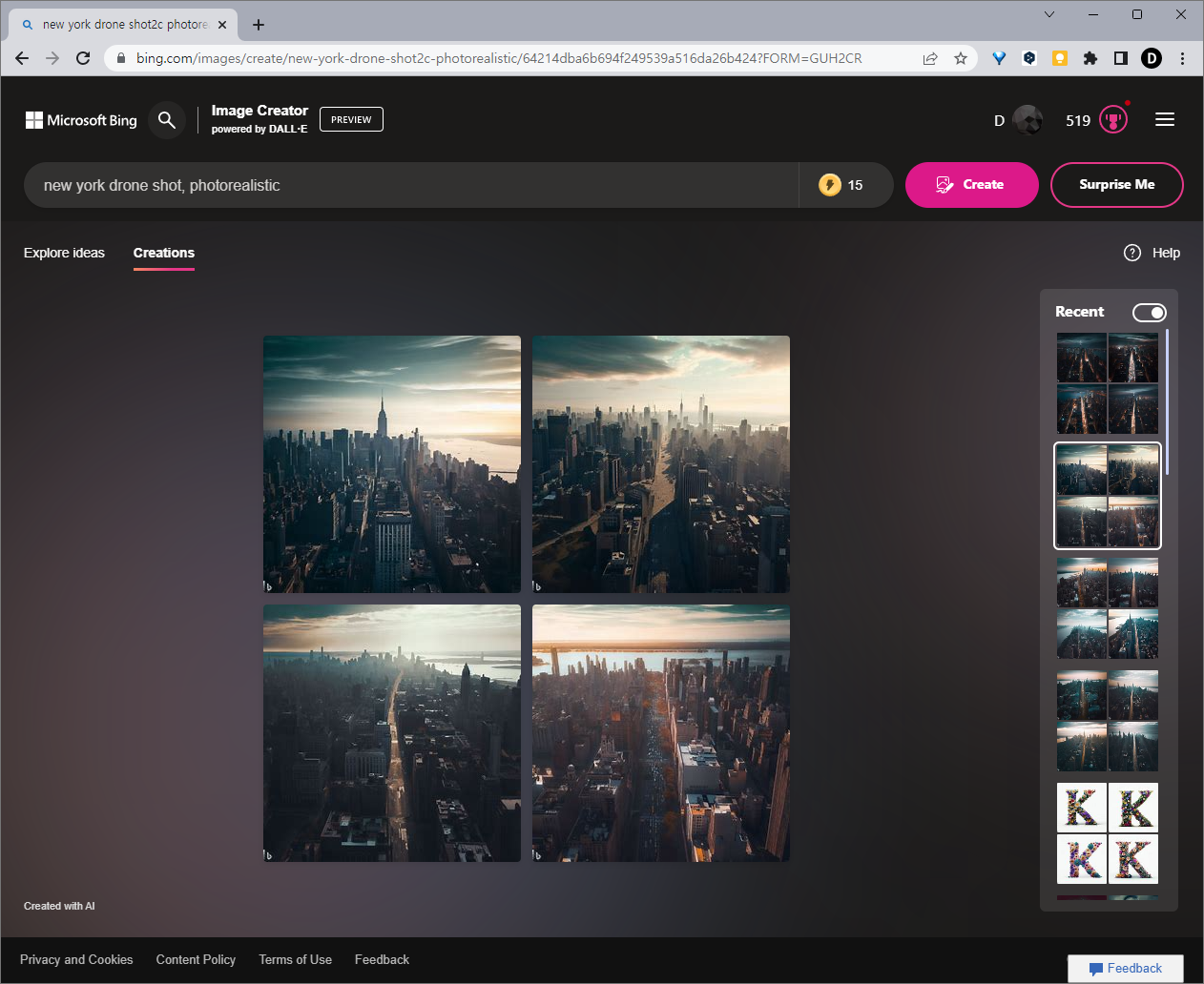 2. DALL-E 기반의 무제한 무료 Bing Image Creator 로 사용해 봅니다. 말도 안되는 프롬프트들을 정말 다양하게 넣어봅니다. 첫 화면에 나오는 다른 사람들이한 프롬프트를 복사하여 넣어봅니다.