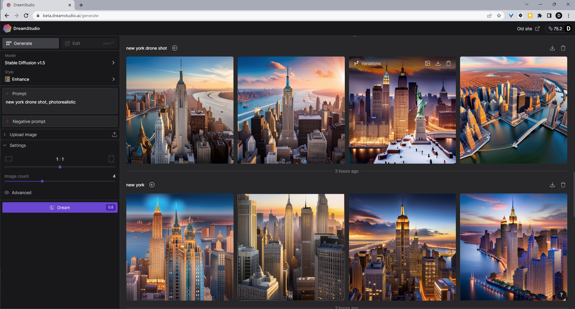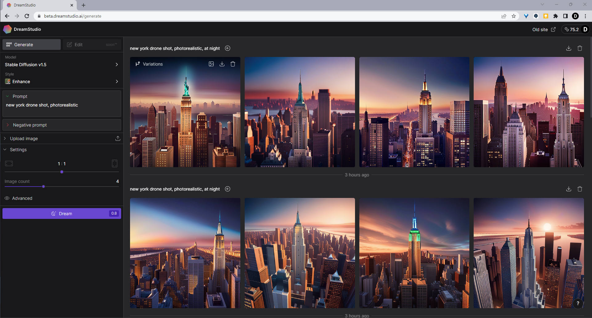 4. Dreamstudio.ai / 총 500장 무료 / Stable Diffusion 공개한 stability.ai 사의 서비스, 해상도 따라 차감비율 다름.