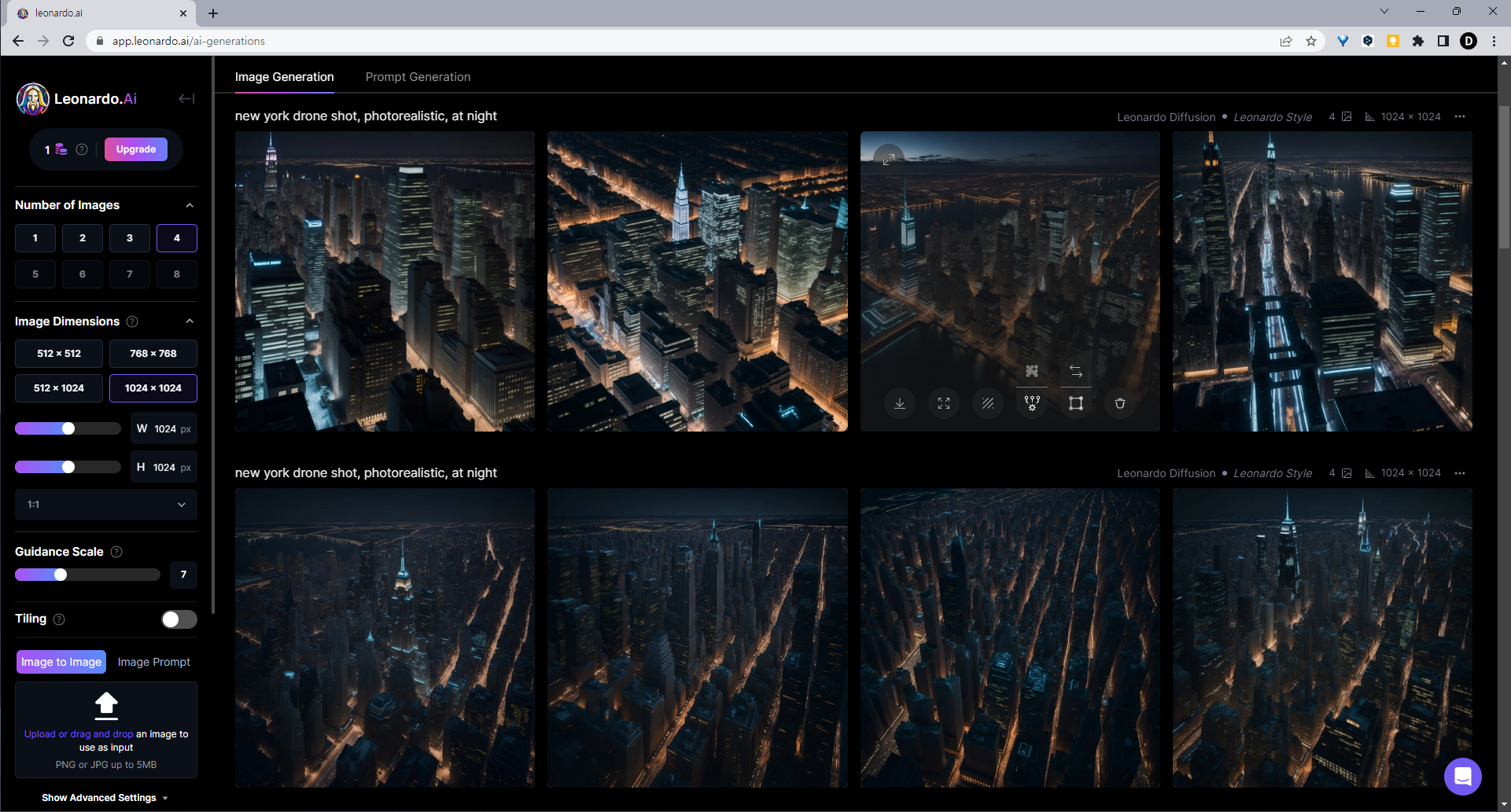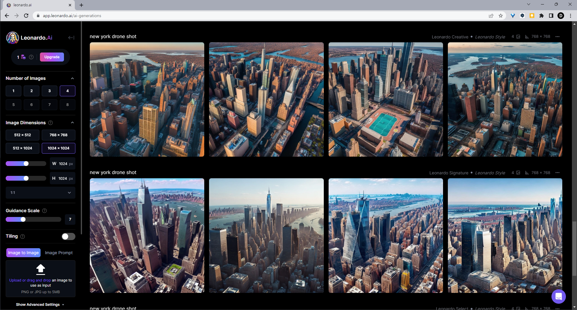 4. Leonardo AI 서비스로 프롬프트를 따라하며 연습해봅니다. 초반엔 하루 150장 정도면 충분합니다. Stable Diffusion 기반인데 Leonardo에서 파인튜닝한 모델들도 있고 성능이 괜찮습니다.