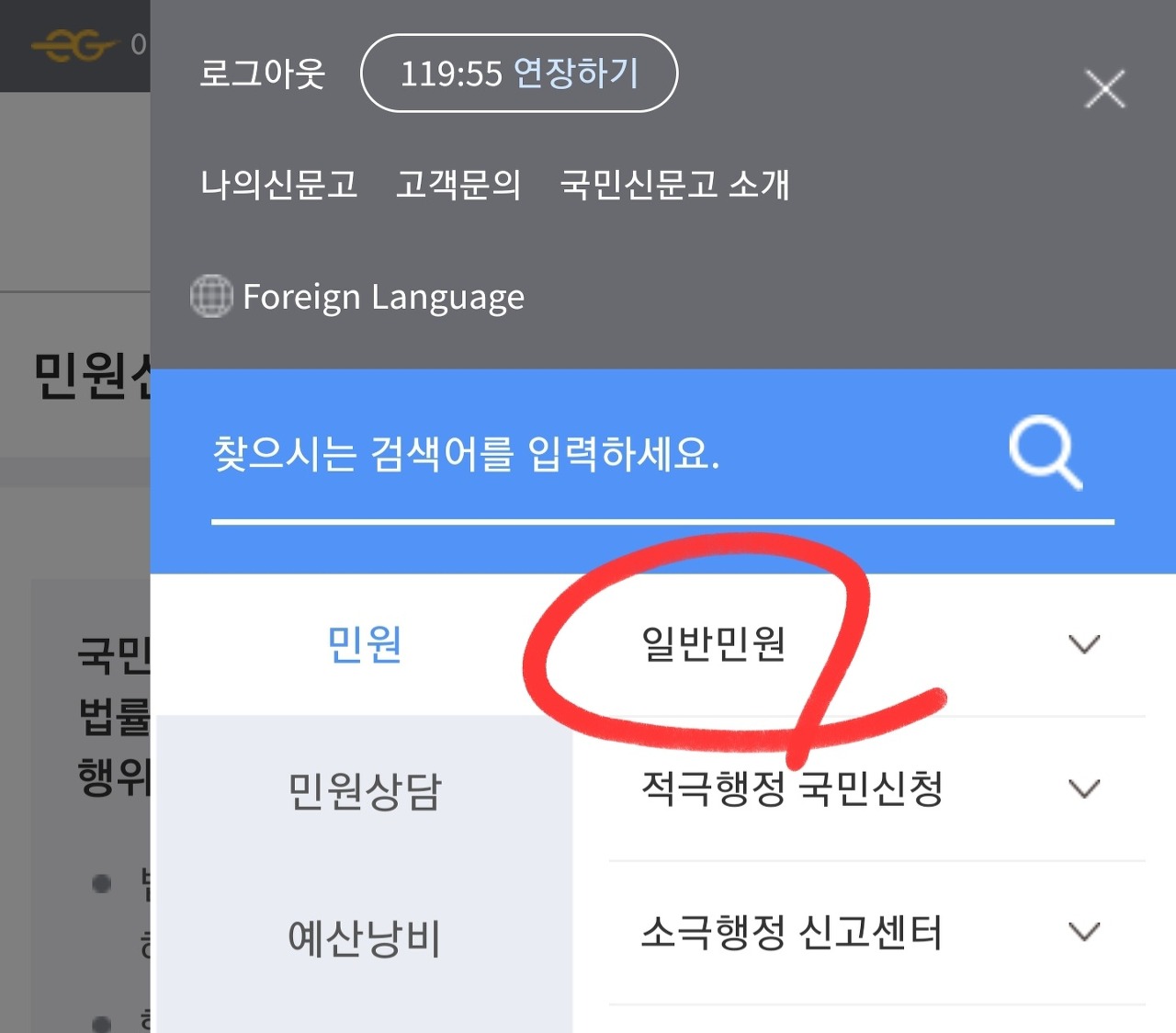 1.오른쪽위의 메뉴에서 일반민원을 클릭합니다.