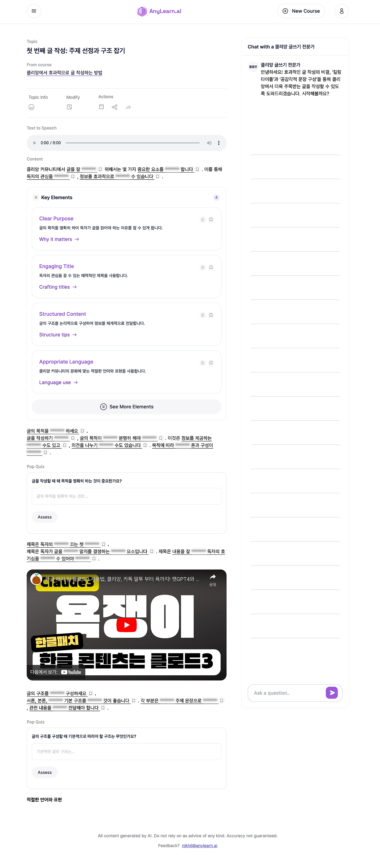 Anylearn은 혼자서 체계적으로 학습하기를 원하는 분들, 특히 글로 된 자료로 학습하는 것을 선호하시는 분들께 유용할 것 같네요. 다만 AI가 생성한 자료이니만큼 내용이 100% 정확하지 않을 수 있음을 염두에 두시고, 꼭 다른 자료로 확인해보시는 것을 추천드립니다.