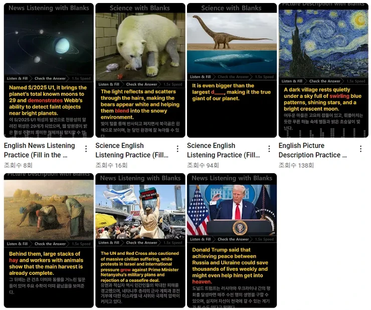 그래서 이번에는 트렌드에 맞게 쇼츠로 시도해 보았습니다. 다만, 영어 뉴스, (유명한) 그림 묘사, 짧은 과학 상식 등을 다루기에 초급자분들에게는 다소 어려울 수 있습니다.
