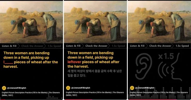 - ①빈칸 채우기 → ②정답 확인 → ③빠른 듣기 (1.5배속)