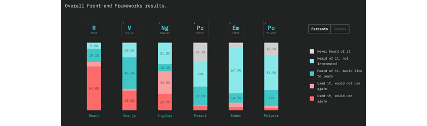 StackOverflow(www.stackoverflow.com)의 개발자 설문조사는 이들 프레임워크의 일상적인 쓰임새를 확인하는데 유용합니다. 가장 최근의 설문조사 결과를 보면 GitHub의 스타 수와는 달리 훨씬 더 많은 개발자가 Vue.js보다 React로 작업하고 있음을 알 수 있습니다.