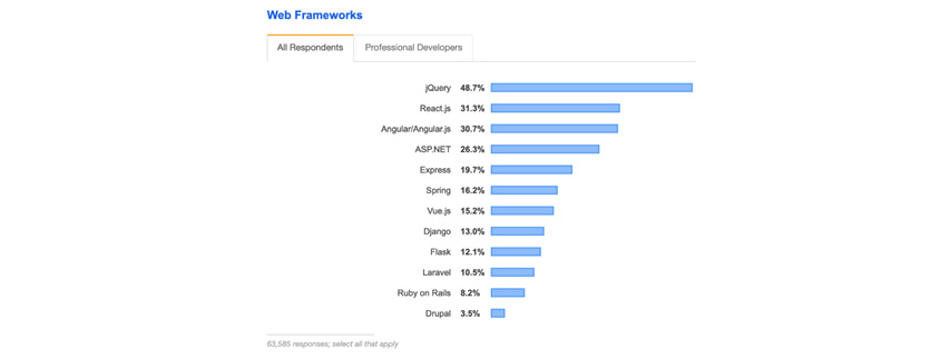 그림2 - 사용 중인 웹 프레임워크에 대한 StackOverflow의 개발자 설문조사 결과(2019년)