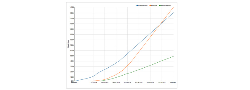 Angular와 React의 인기를 확인하는 좋은 방법은 GitHub 저장소의 스타 수입니다. Vue.js에 대한 스타 수의 급격한 변화는 2016년 중반에 발생했으며, 최근에는 Vue.js가 React를 제치고 가장 인기있는 프레임워크로 발돋움하고 있습니다.