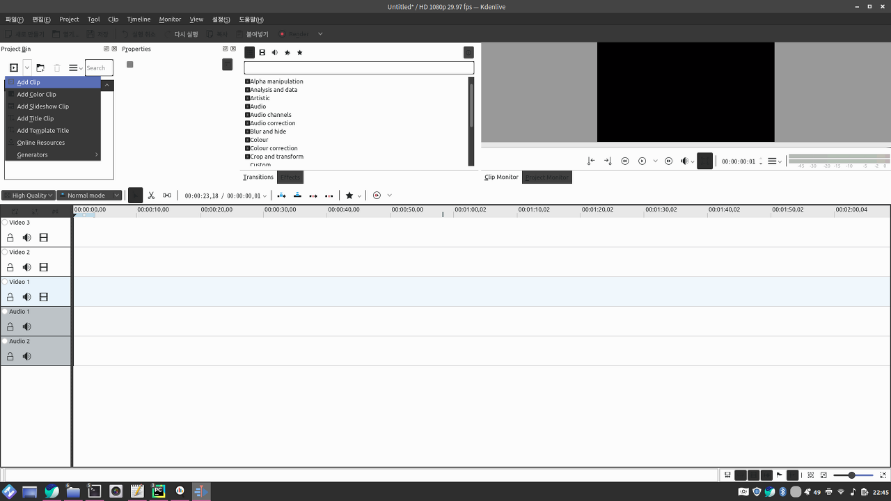 다음은 Kdenlive 를 통해 영상 파일과 음성 파일을 합치는 방법입니다.