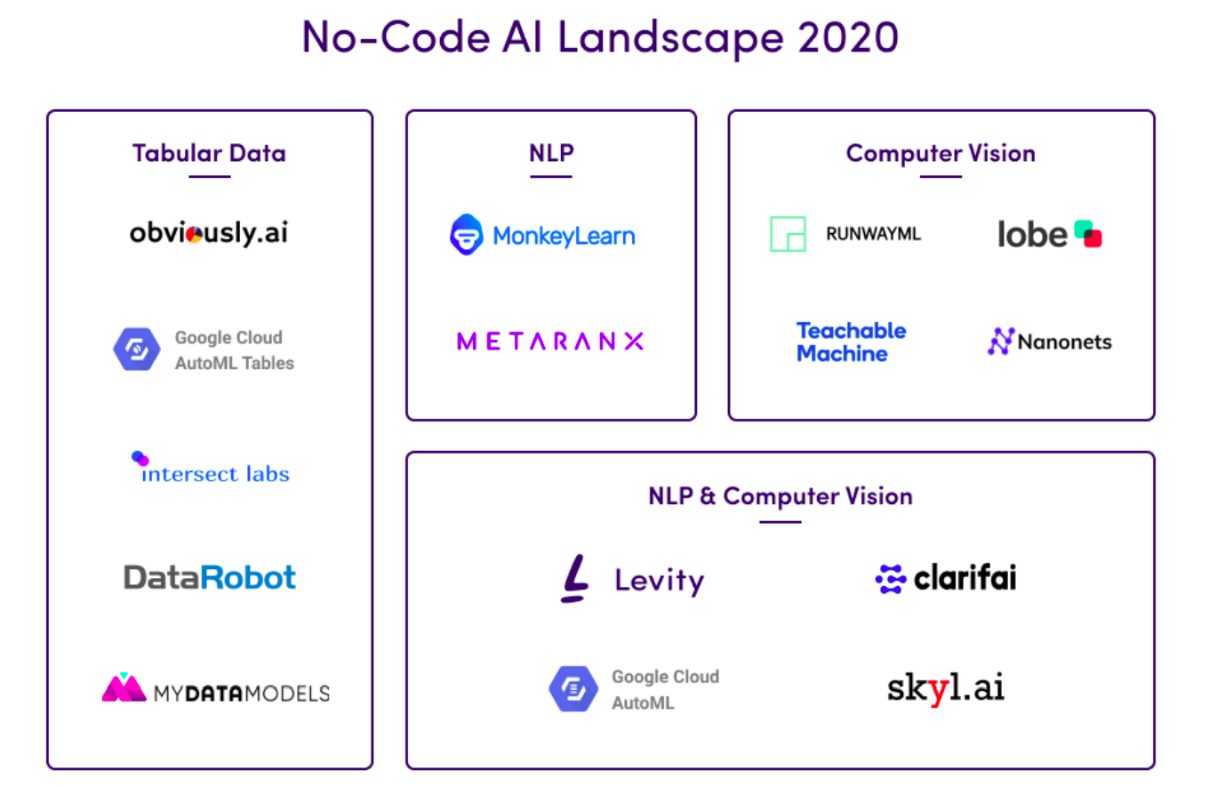 No code 서비스를 제공하는 서비스를 한번에 볼 수 있는 장표를 하기와 같이 공유합니다. 카테고리를 보면, - Product builders Web, Mobile App, AI & Data Science, Game, AR & VR 3D, Automation, Chatbot, Vo..
