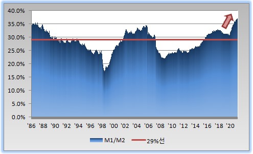 (사상 최대치를 갱신하고 있는 M1/M2 비율 추이)