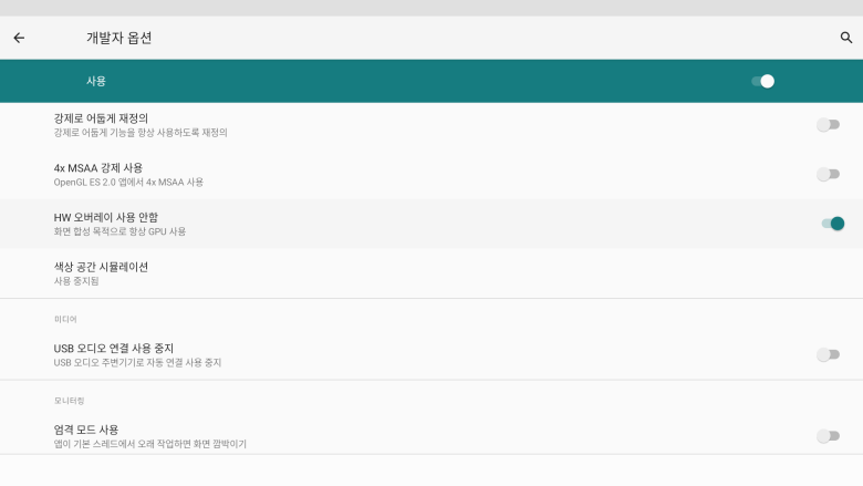어떻게 하면 없앨 수 있나 눌러보다 개발자 옵션에서 HW 오버레이 사용 안함을 ON으로 설정하면,