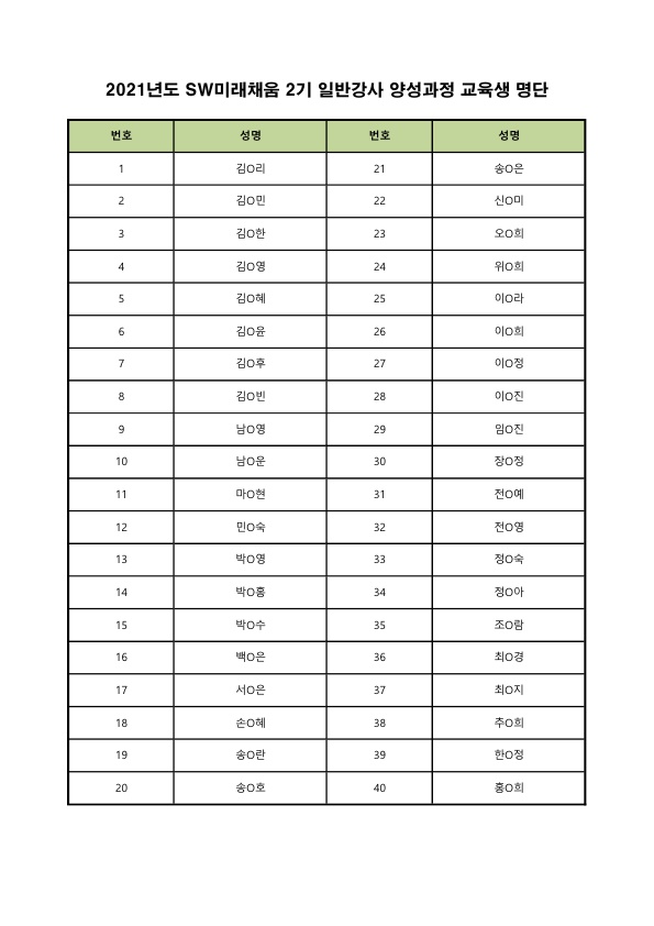 SW미래채움 2021년도 2기 일반강사 양성과정 교육생 명단