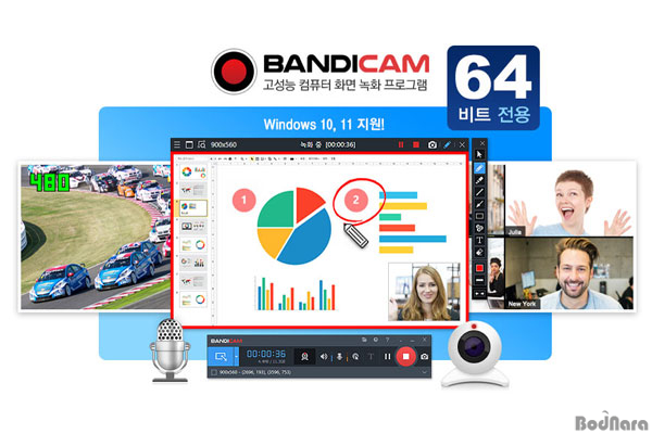 기존 버전의 반디캠은 윈도우 32비트뿐 아니라 64비트 운영체제에서 모두 사용할 수 있었지만, 이번에 새롭게 출시된 64비트 전용버전은 64비트 윈도우 운영체제에서만 구동된다. 기존 반디캠과 비교해 프로그램 로딩 속도가 2.5배 빨라지고, 화면 녹화 성능이 10% 향상됐으며, 화면 녹화 중 사용하는 펜 그리기, 화살표, 도형, 지우개 등 실시간 그리기 기능의 성능이 향상돼 보다 정밀하고 부드러운 필기가 가능해진 것이 특징이다.
