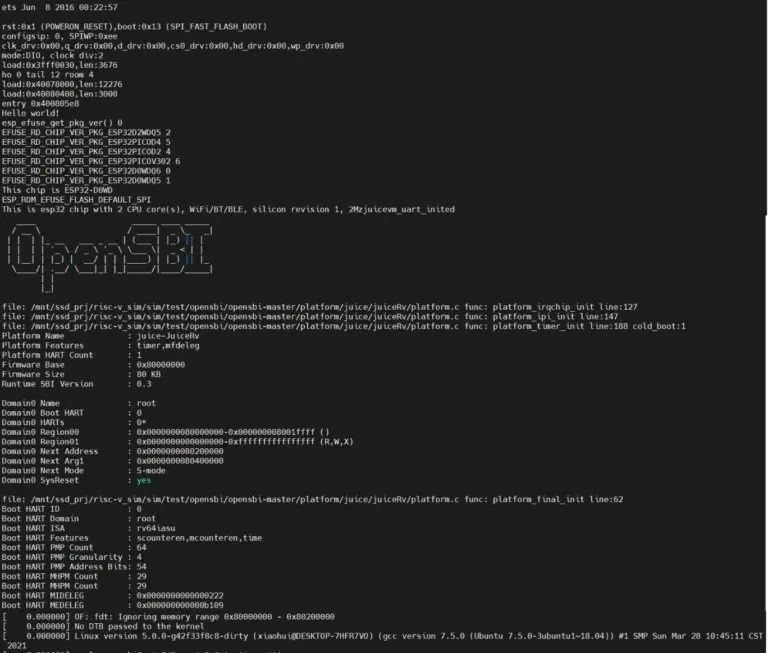 부트 로그는 ESP32-D0WD 듀얼 코어 Xtensa 프로세서가 있는 부트로더 출력이 결국 Linux 5.0.0을 부팅하는 것을 보여줍니다. 그러나 부트로더가 "작은 RISC-V 가상 머신"으로 설명된 " Juice Vm "으로 점프 한 다음 Linux 커널과 작은 파일 시스템을 로드하는 OpenSBI RISC-V Open Source Supervisor Binary Interface 를 호출 하므로 부팅 프로세스가 다소 복잡 합니다.
