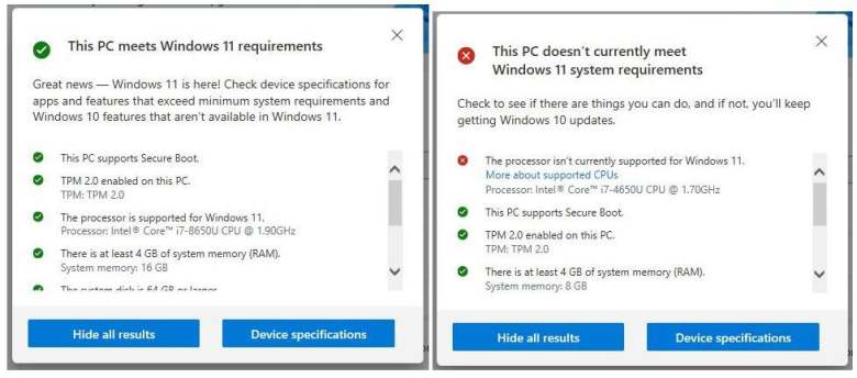 요구사항을 충족/미충족한 PC의 검사 내용을 확인하려면 ‘모든 결과 보기버튼을 클릭한다. 테스트 결과 미충족으로 분류된 PC는 2014년형 구식 서피스 프로 3이며, 실패한 이유는 4세대 인텔 CPU를 탑재했기 때문이다. 2018년형 레노버 씽크패드 X380 요가는 8세대 인텔 CPU와 기타 필요한 구성요소가 탑재되어 테스트를 통과했다. 두 기기의 세부사항 일부가 그림 3에 표시되어 있다.