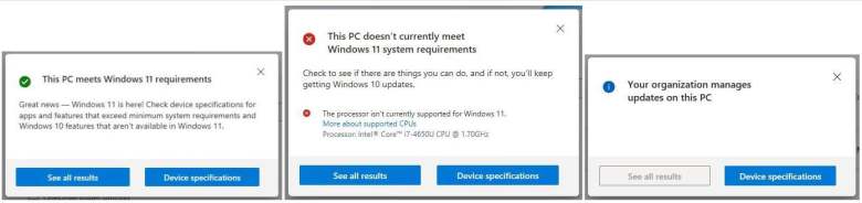 호환성 확인 실행 후 프로그램이 3개의 창 중 하나를 표시한다. 확인을 통과하면 “요구 사항을 충족합니다” 메시지(왼쪽)가 표시되고, 실패하면 “요구 사항을 충족하지 않습니다” 메시지(가운데)가 표시되며, 윈도우 에듀케이션이나 엔터프라이즈, IT 부서가 관리하는 기타 버전을 구동하는 PC는 “조직이 이 PC의 업데이트를 관리합니다”(오른쪽)라는 메시지가 표시되지만 호환성 확인은 하지 않는다. 필자는 업무용 PC에서 엔터프라이즈 버전을 설치한 업무용 PC에서 프로그램을 실행한 후 피드백 허브(Feedback Hub)를 통해 마이크로소프트에 이 오류를 보고했다.