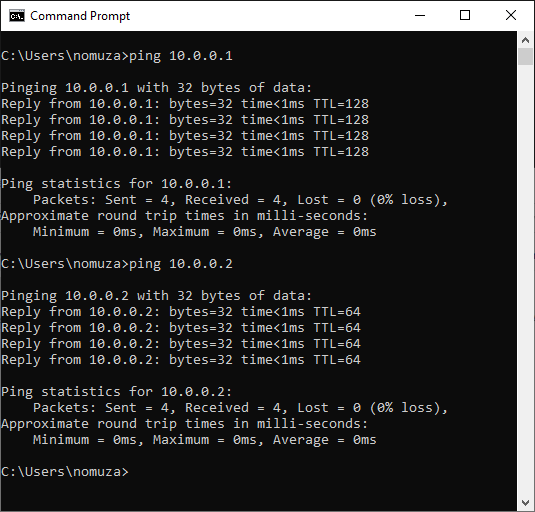 윈도(10.0.0.1)에서 핑을 쏴보면 10.0.0.1 이나 10.0.0.2로 잘 쏴지지만