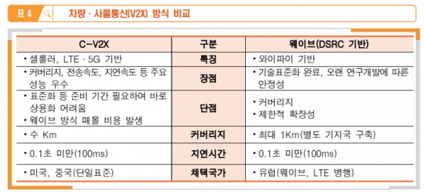 정원선 한국자동차연구원 센터장은 "유럽과 북미 모두 초기에는 지능형 교통시스템 인프라로 DSRC 방식 채택을 고려했지만, 최근 시장 흐름을 판단해 C-V2X를 적용하는 방향으로 선회했다"며 "북미의 경우에는 미국 연방 통신 위원회(FCC)에서 DSRC로는 정보전달에 한계가 있어 C-V2X로의 전환을 권고, 3년 이내 DSRC는 모두 철거하는 것을 명령한 바 있다"고 설명했다.