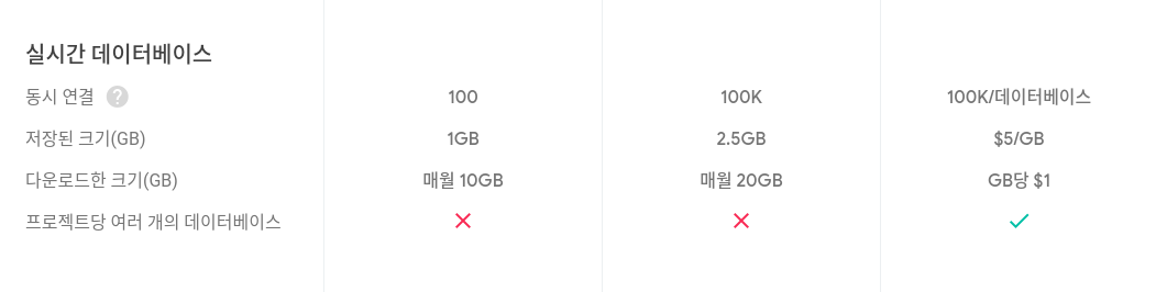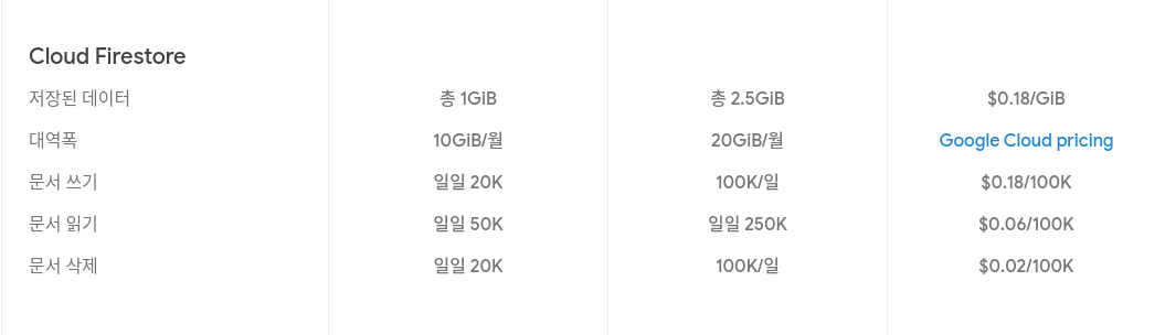 Realtime database는 용량, 대역폭(다운로드 크기)에 대해 주로 과금을 하고 있습니다. 반면 Firestore는 용량, document CRUD 연산 횟수에 따라 과금을 주로 하고 있습니다.