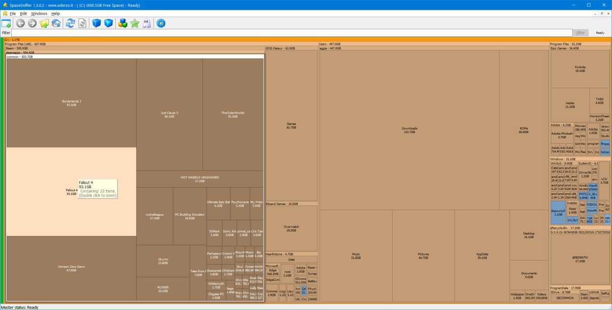 PC 저장 공간 관리는 까다로운 작업이다. 윈도우에서 드라이브에 남은 공간을 알 수 있지만, 100만 개의 세부 디렉토리에 들어가 내용을 확인하고 삭제를 결정하는 것은 사용자 본인이다. 우더조 소프트웨어의 스페이스스니퍼는 전체 드라이브를 스캔해 파일과 폴더를 시각적 그리드로 표시한다.