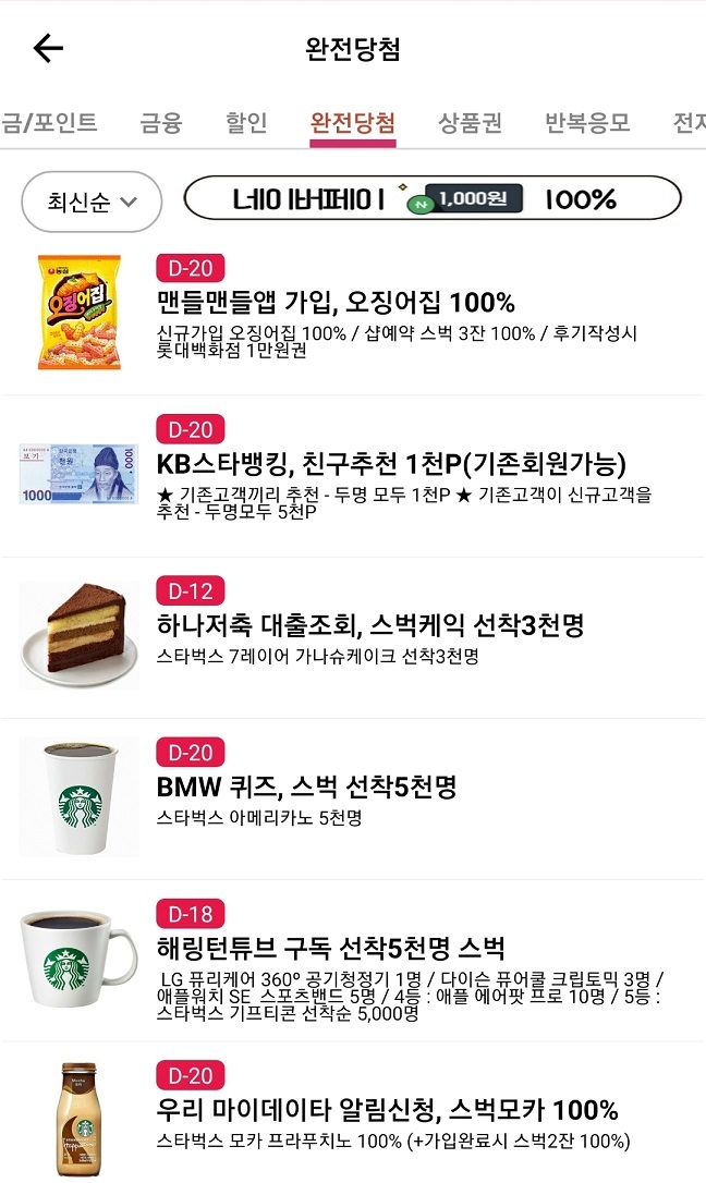 원래는 간단한 앱소개나 경험담 적으려고 했는데...너무 길어졌습니다. 결론만 말하자면, 이것저것 다 하기 싫으시면 앱깔고 푸쉬오는 이벤트만 일단 해보세요. 백퍼당첨만 푸쉬넣어주고 여태까지 광고는 한번도 안왔습니다. 그것만 해도 스벅 몇잔, 편의점 도시락은 쏠쏠히 먹습니다. 그외에 포인트모으기나 타 앱테크해보는거는 천천히 하시면 되요. 아 그리고 클리앙에서 인기있었던 네이버페이 줍줍도 항상 갱신되어 올라옵니다. 그럼 이만
