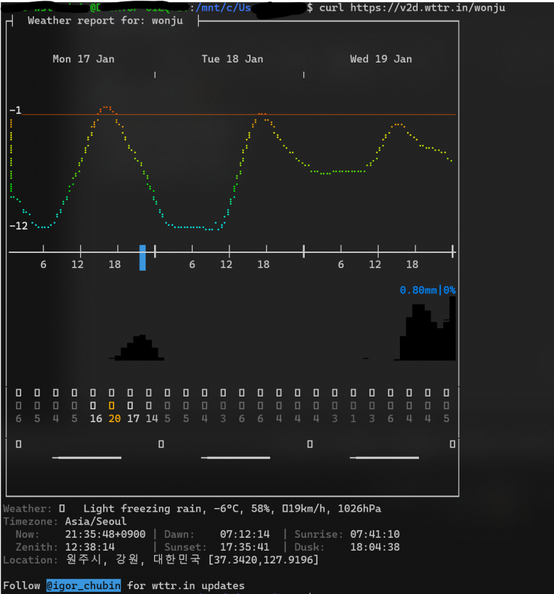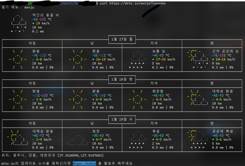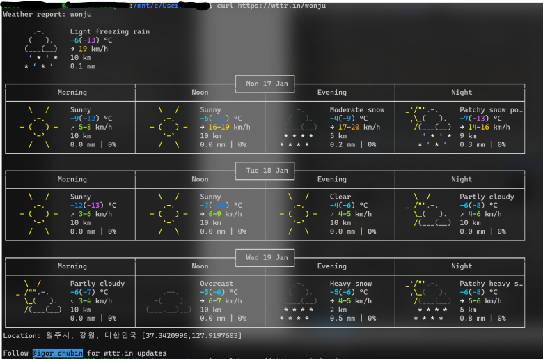 여튼 curl https://wttr.in/지역이름 curl https://v2d.wttr.in/지역이름 이런식으로 사용하는거 같네요..