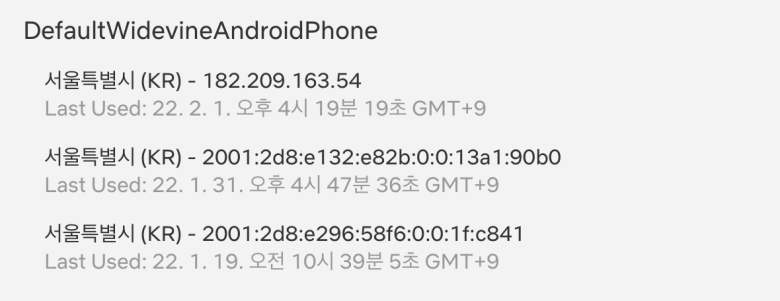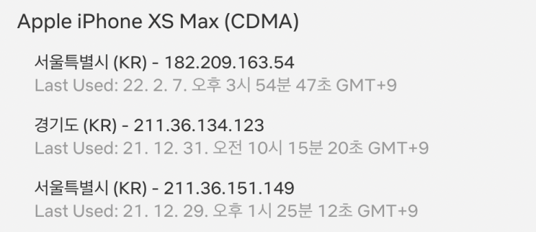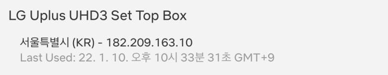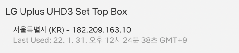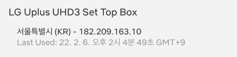 어머니는 폰보다는 유플러스 셋톱으로 넷플릭스를 보십니다. 처음에는 어머니 유플러스 셋톱이라 생각했는데 지역이 전부 서울이네요. 저희 집은 인천입니다. 그리고 1월초부터는 제가 연결해놓은 애플TV 4K로 티비에 물려놔서 유플러스 셋톱은 연결도 안되어있어요.