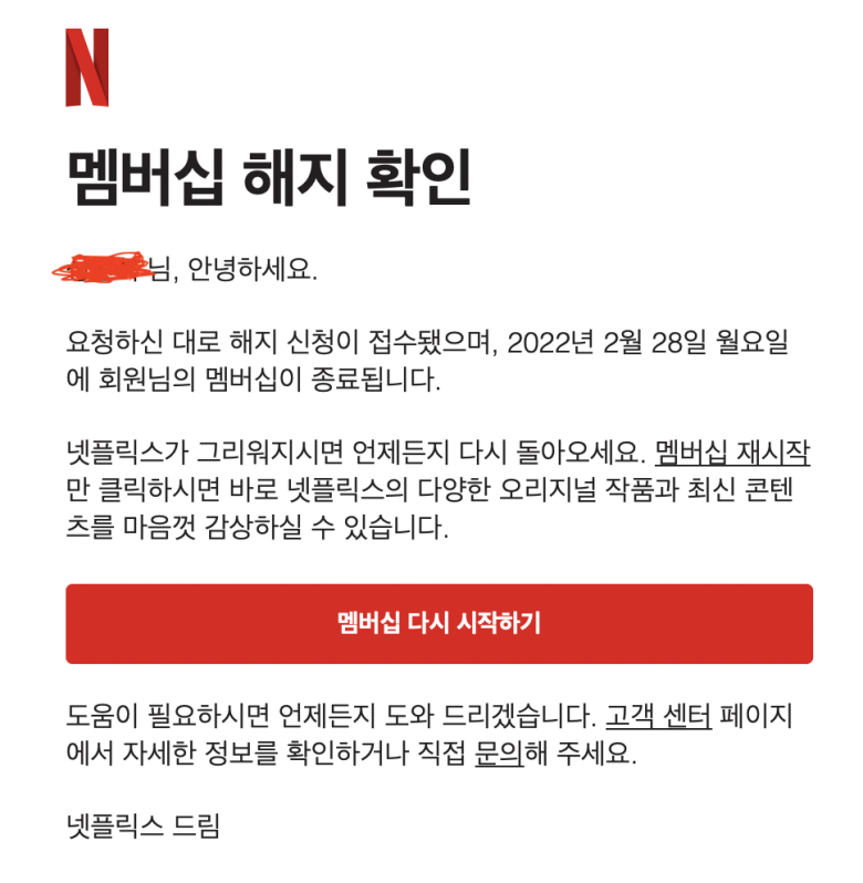 오늘 메일을 하나 확인했습니다. 제가 넷플 멤버십 해지 요청을 했다네요?