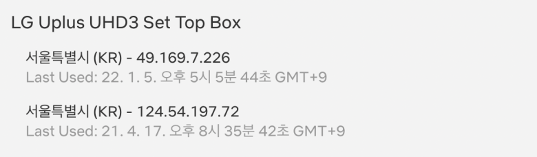 어머니는 폰보다는 유플러스 셋톱으로 넷플릭스를 보십니다. 처음에는 어머니 유플러스 셋톱이라 생각했는데 지역이 전부 서울이네요. 저희 집은 인천입니다. 그리고 1월초부터는 제가 연결해놓은 애플TV 4K로 티비에 물려놔서 유플러스 셋톱은 연결도 안되어있어요.
