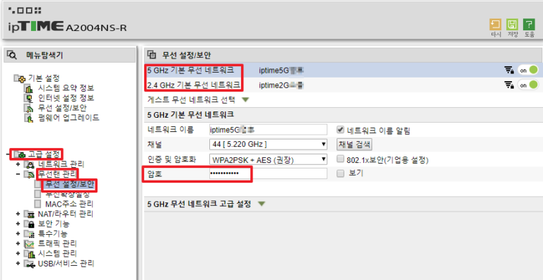 만약 무선도 사용 한다면 같이 변경을 해주세요. 고급 설정 -> 무선랜 관리 -> 무선 설정/보안 에서 5 GHz 와 2.4 GHz 두개다 변경해 주시면 됩니다.