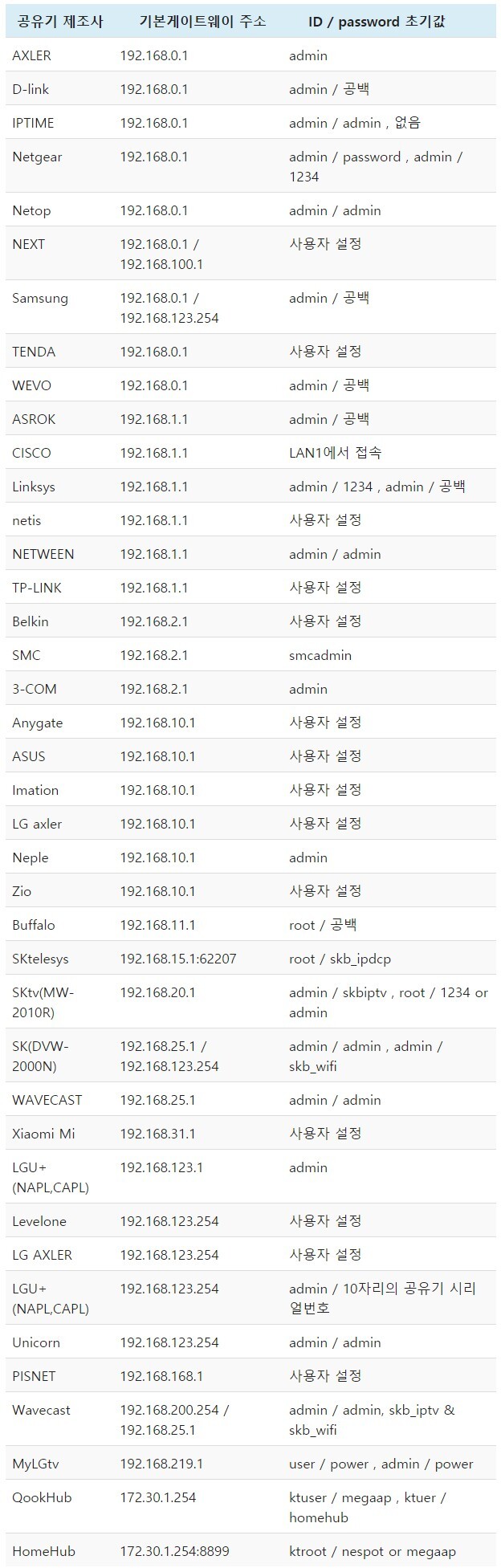 제조사별 공유기 접속주소 및 비밀번호