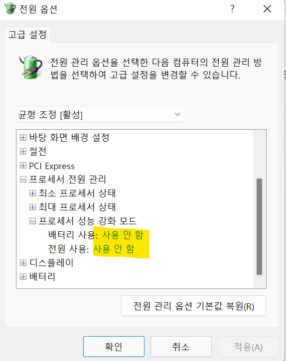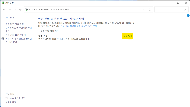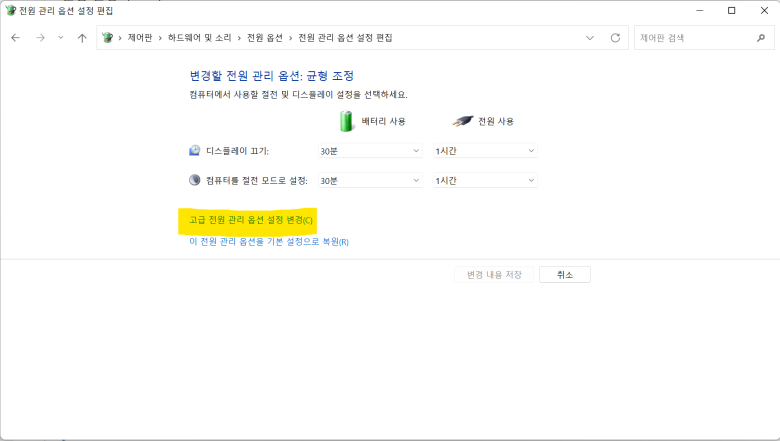 고급 전원 관리 옵션 설정 변경 클릭