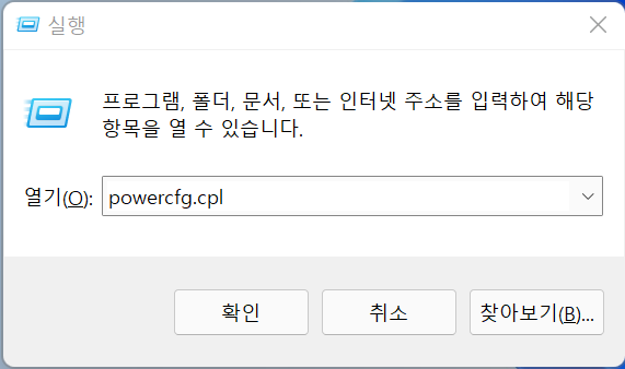 win키 + R 눌러서 powercfg.cpl 입력합니다.