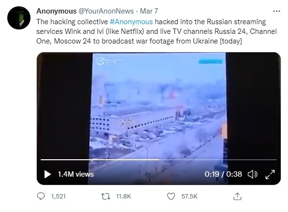 [서울=뉴시스] 국제 해커 단체 어나니머스는 7일(현지시간) 소셜미디어(SNS)를 통해 러시아 국영 TV를 해킹하고 우크라이나 전쟁 장면을 송출했다고 밝혔다. (출처 : 어나니머스 공식 트위터) 2022.03.08. *재판매 및 DB 금지