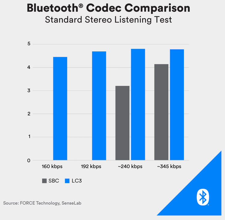 블루투스 LE 오디오는 일반 구형 Bluetooth에 비해 상당한 전력소비 절감을 제공할 수 있습니다. LE 오디오는 또한 호환되는 표준 라이선스 오디오 코덱의 비트레이트를 확장하여 일부 상황에서 잠재적으로 향상된 오디오 품질을 제공합니다.