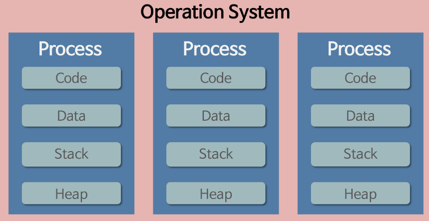 프로세스 = 프로그램 + 프로세스제어블록이며 프로세스는 각각 독립된 메모리 영역 (Code, Data, Stack , Heap의 구조)을 할당받는다.