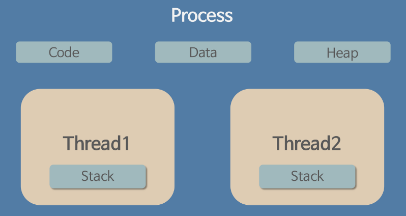 쓰레드는 어떠한 프로그램 내에서, 특히 프로세스 내에서 실행되는 흐름의 단위를 말한다. 즉 쓰레드는 프로세스 내에서 각각 Stack만 따로 할당받고 Code, Data, Heap 영역은 공유한다. 스레드는 한 프로세스 내에서 동작되는 여러 실행의 흐름으로, 프로세스 내의 주소 공간이나 자원들(힙 공간 등)과 같은 프로세스 내에 스레드끼리 공유하면서 실행된다. 같은 프로세스 안에 있는 여러 스레드들은 같은 힙 공간을 공유한다.
