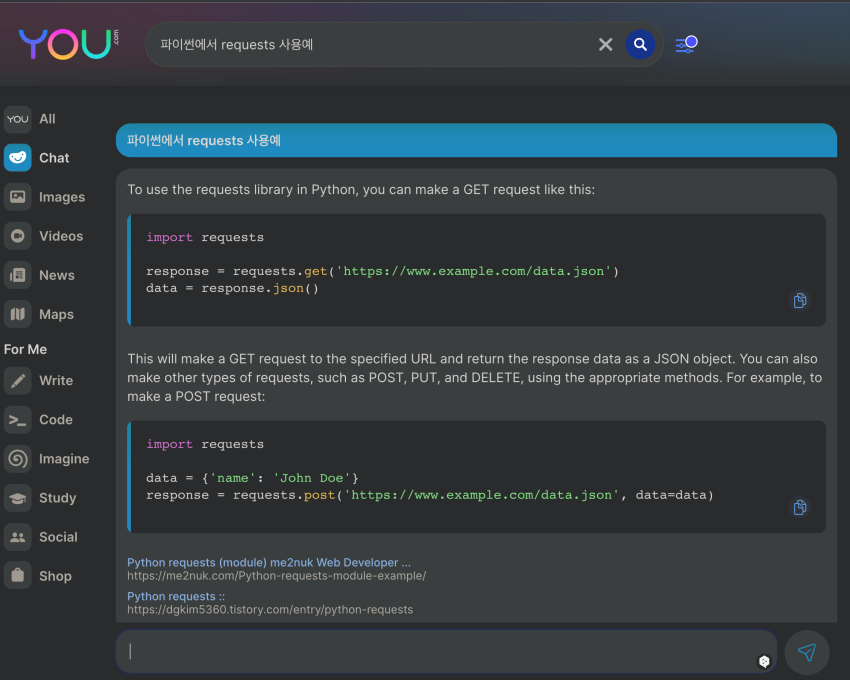 게다가 you.com은 chatGPT와 달리 '자기가 제공한 것에 대한 신뢰성을 높이기 위해' 레퍼런스 자료를 같이 보여줍니다.