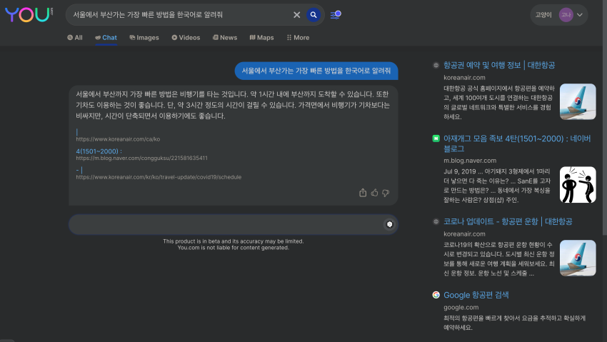 그런데 최근 chatGPT 만큼은 아니지만 AI Chat 도입으로 핫한 곳이 있잖아요. you.com 이라고..