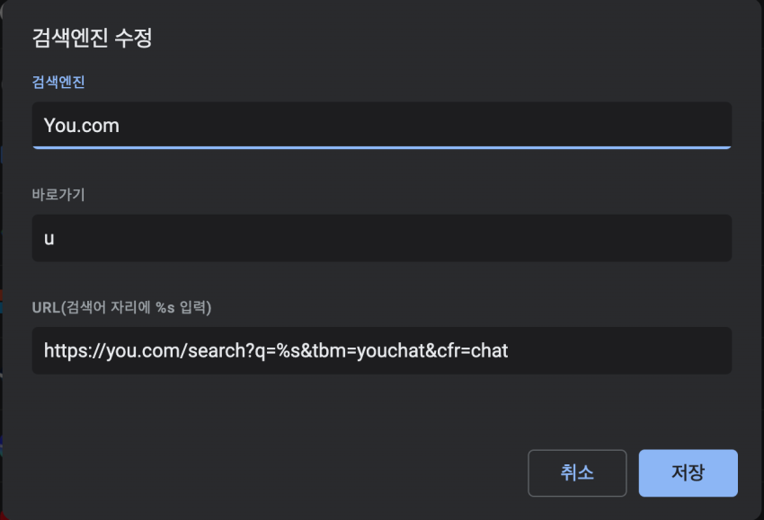 - You.com Chat용 URL: https://you.com/search?q=%s&tbm=youchat&cfr=chat
